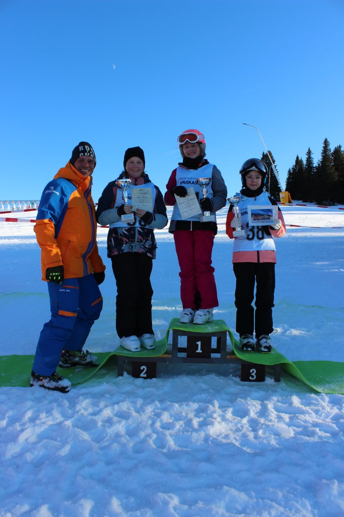 Um 10.30 startete dann das heißersehnte Rennen. Entlang der Zäune scharten sich die Eltern um ihre Kinder anzufeuern. Und diese gaben natürlich ihr Bestes und alle Starterinnen und Starter haben herausragende Leistungen geboten. Besonders hervorzuheben ist dabei, dass ALLE Kinder die gleiche Rennstrecke absolvierten, auch jene, die zwei Tage zuvor zum ersten Mal auf Skiern standen.