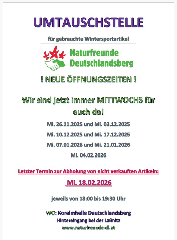 Unsere Umtauschstelle in der Koralmhalle Deutschlandsberg ist in der Zeit vom 26.11.2025 bis 18.02.2026 an folgenden Tagen und Uhrzeiten für Sie geöffnet: